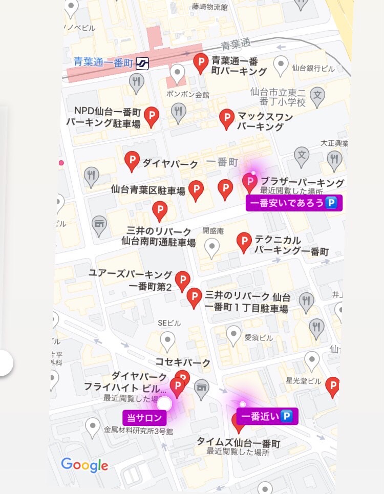 距離でいうとタイムズ仙台一番町が当サロンに最も近いパーキングです。